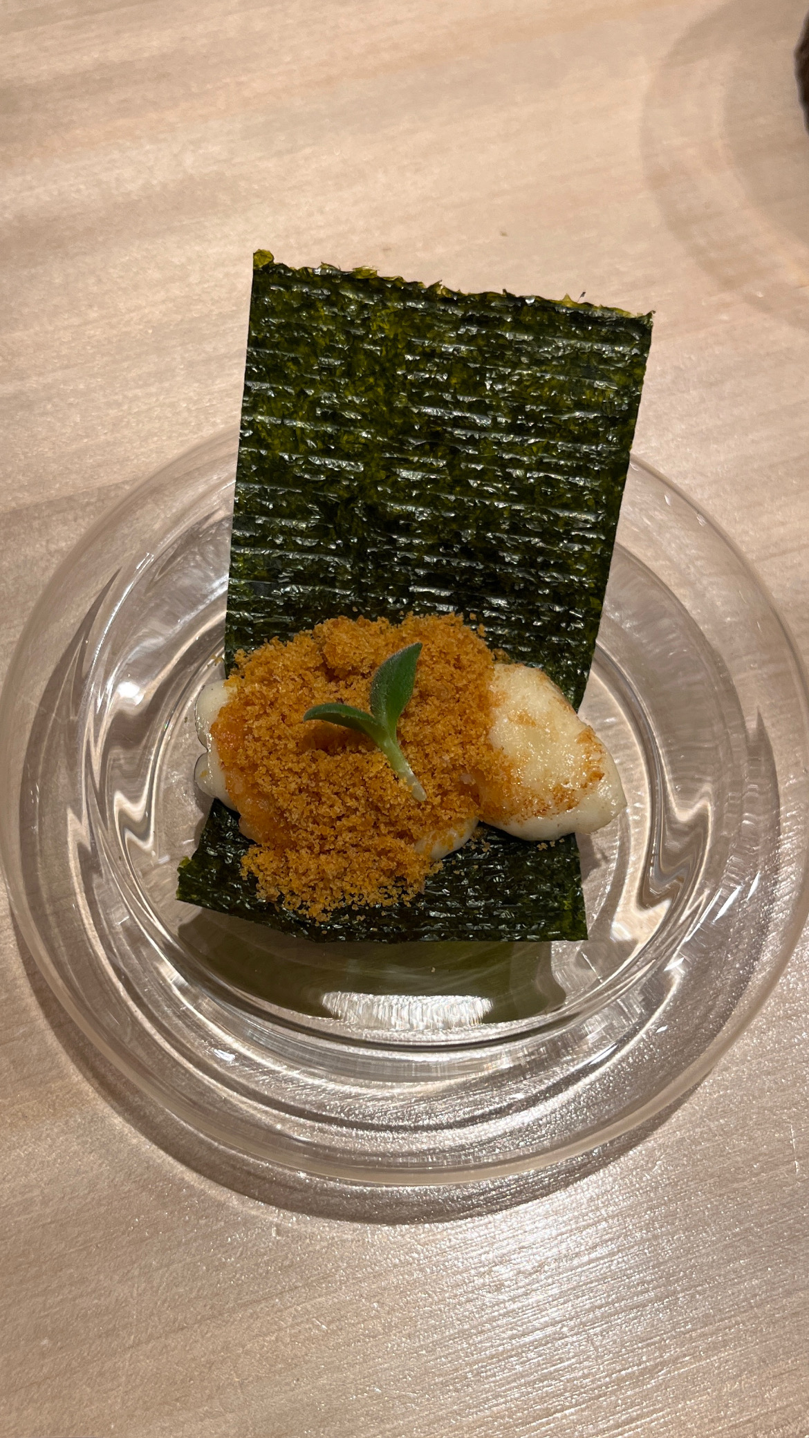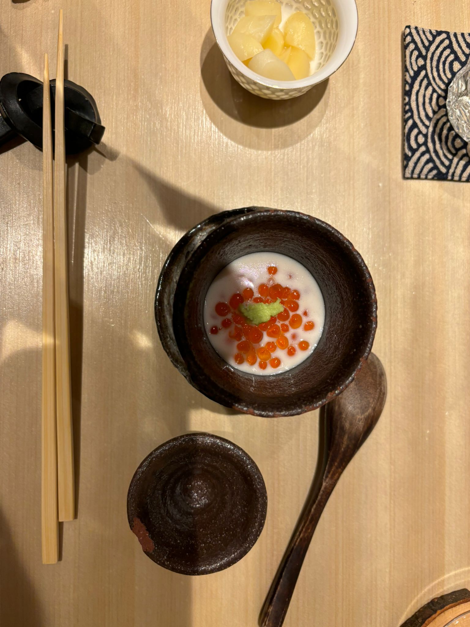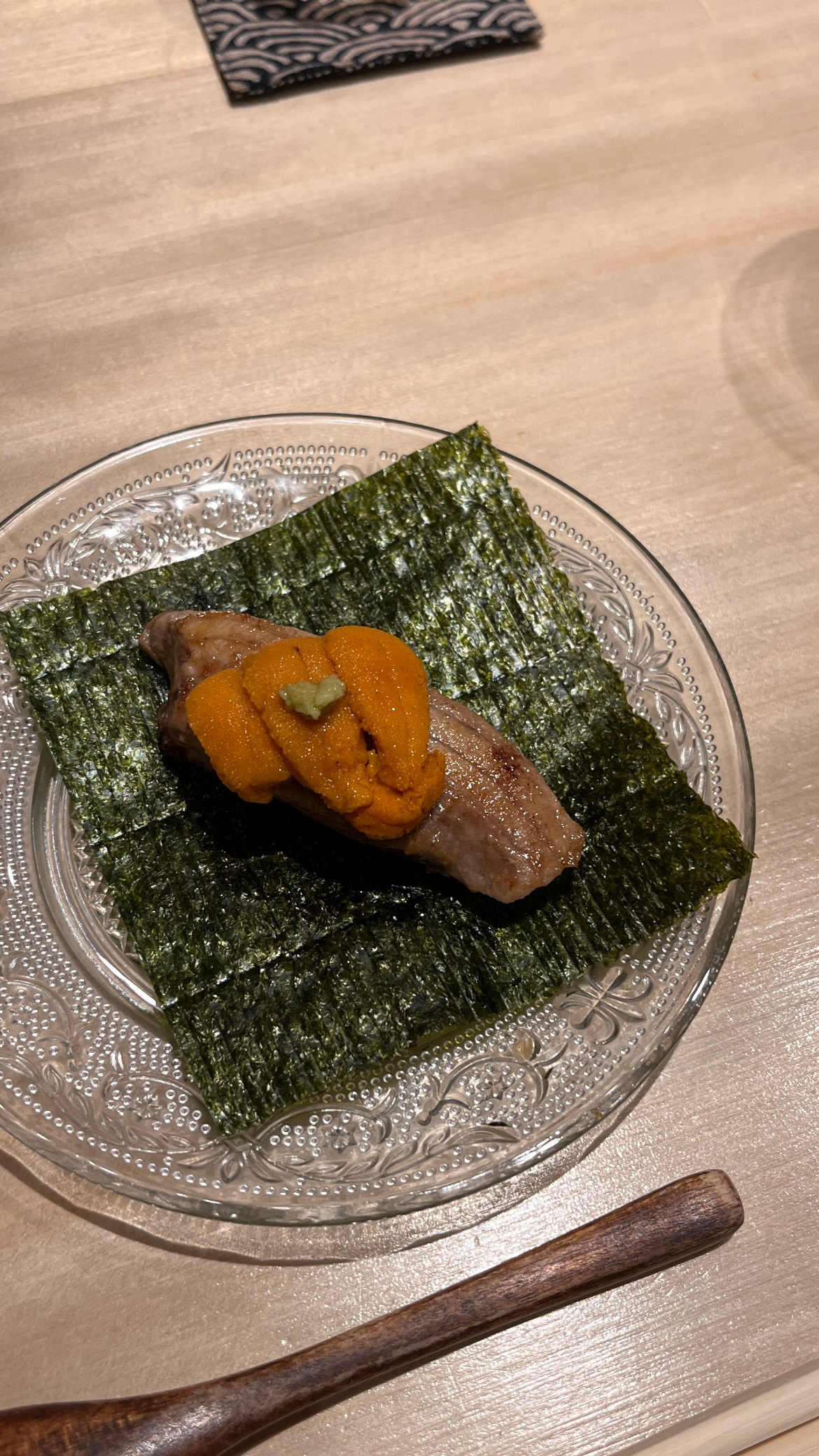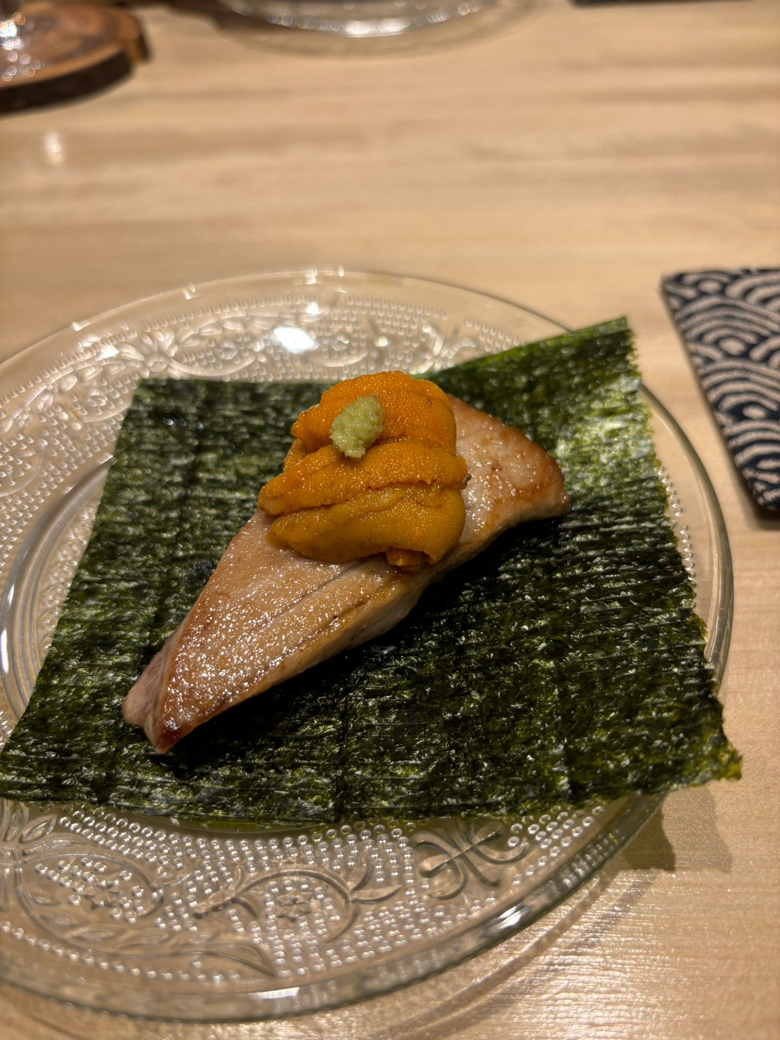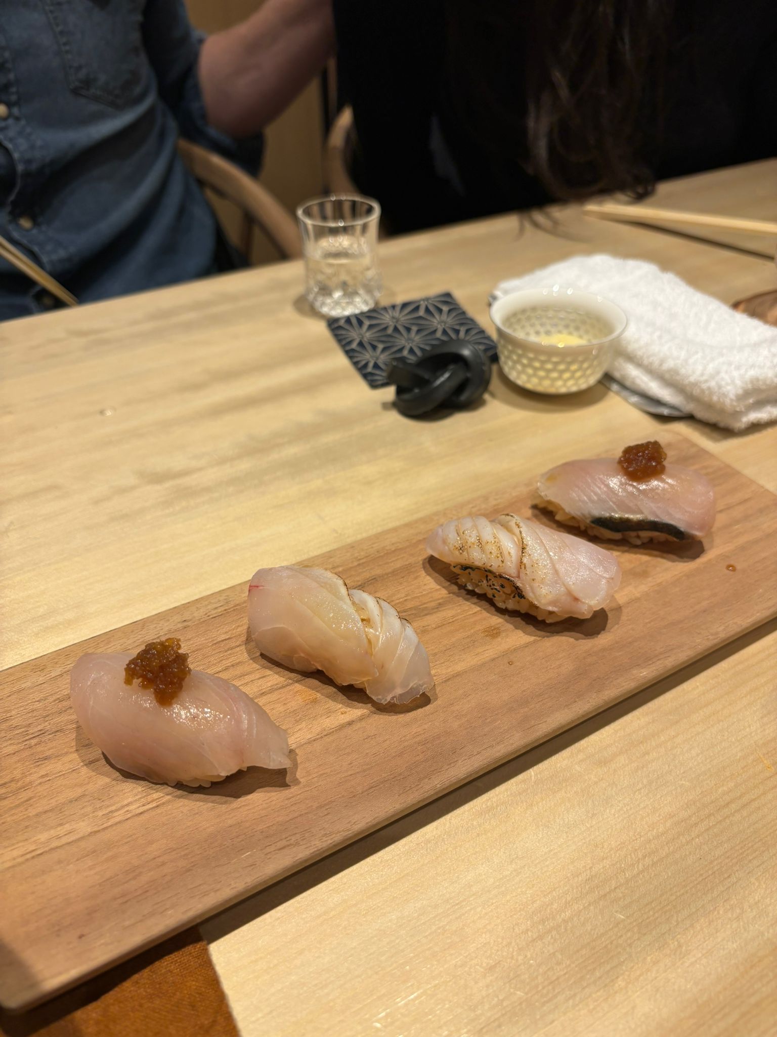 Tuna brain and sea urchin bouquet, Grilled mozzarella cheese and dried mullet roe with seaweed, Black squid, grunt, horse mackerel and bonito sashimi, Instant smoked gizzard shad, Fried shrimp, Homemade tartar sauce simmered scallop chawanmushi, Sea urchin and salmon roe, Red slug, Medium fatty tuna grilled with Saikyo miso, Firefly squid namero nigiri, Fatty taku hand roll, Hollow bamboo sushi with “Hatsume” clams, Espresso, Strawberry and yogurt ice cream, Matcha brulee