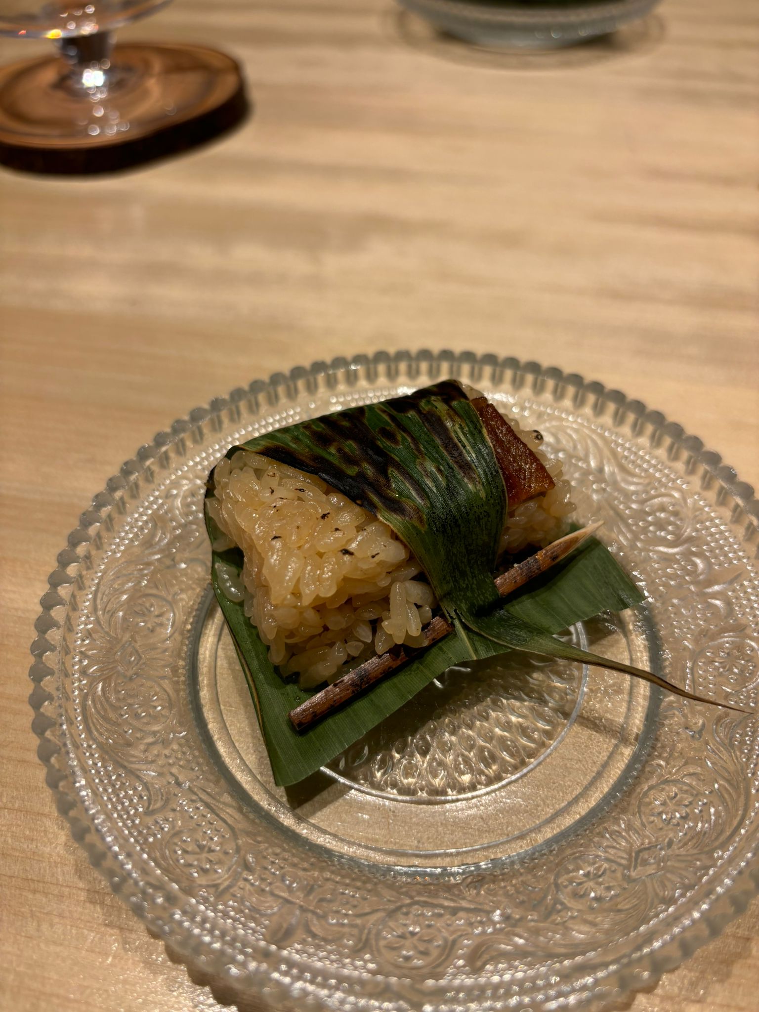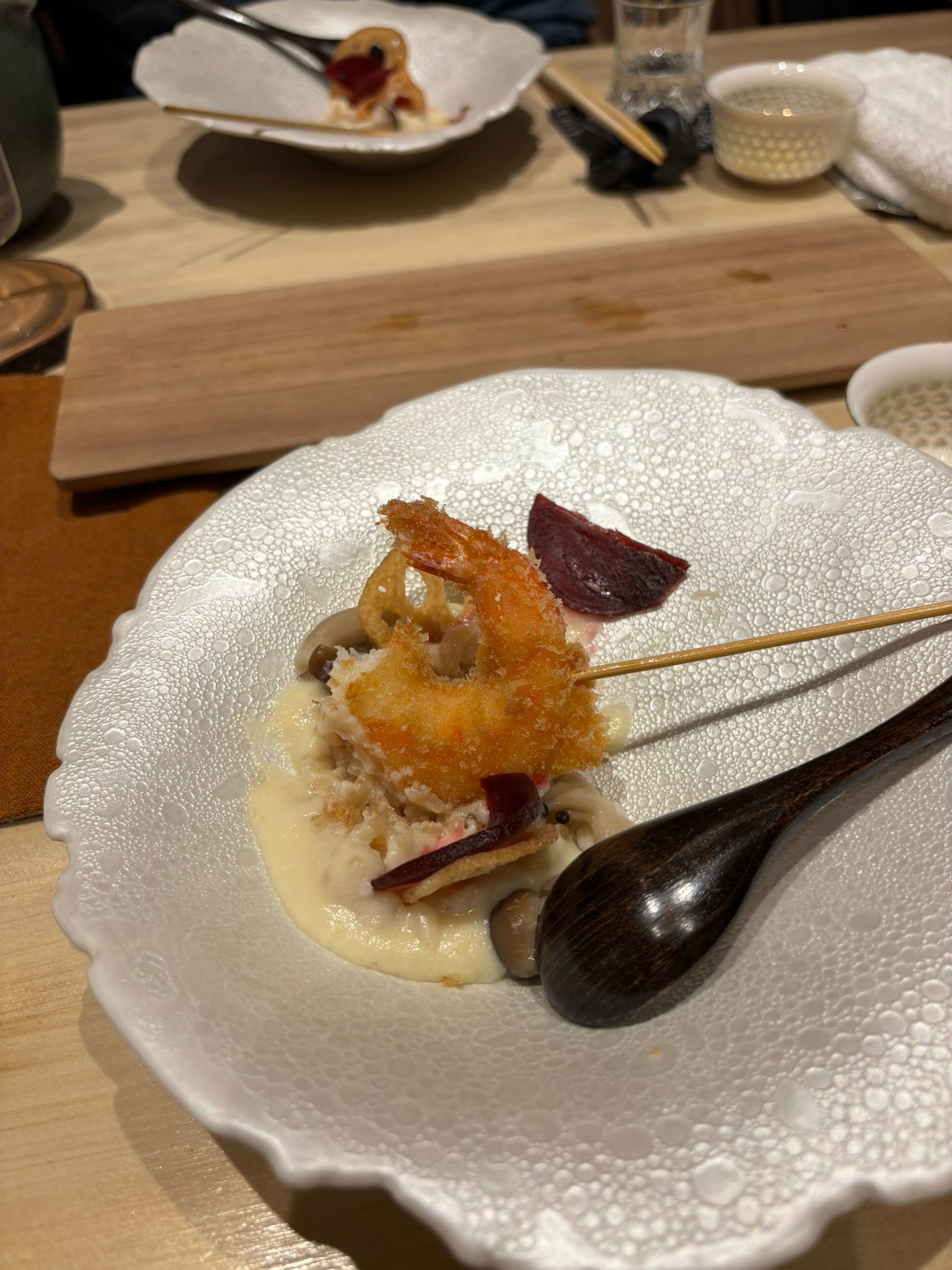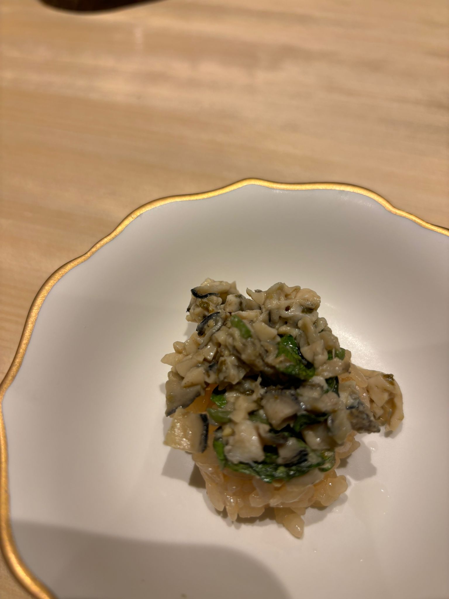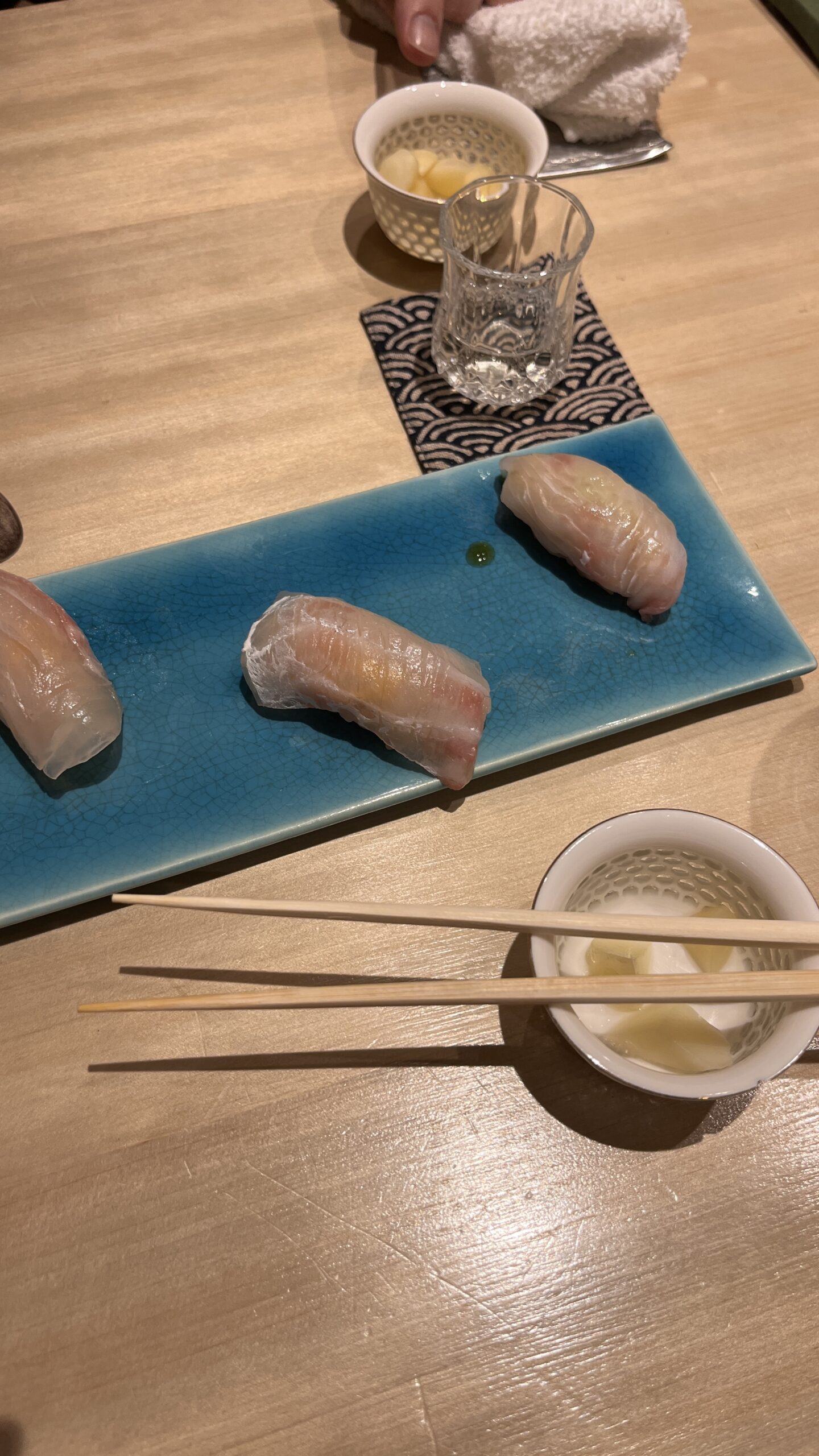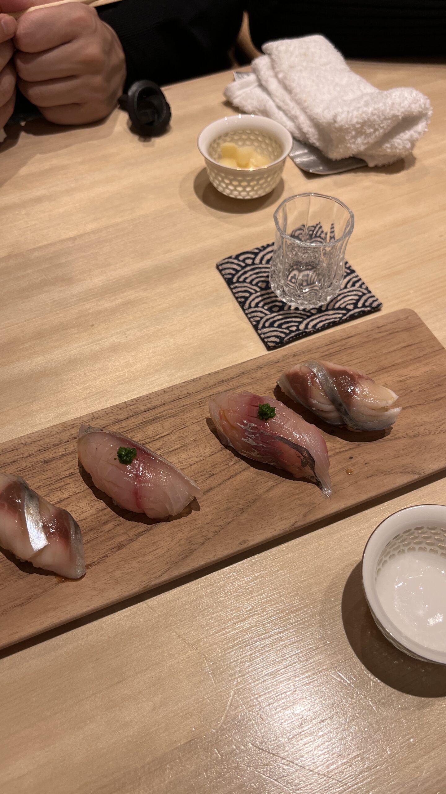 Tuna brain and sea urchin bouquet, Grilled mozzarella cheese and dried mullet roe with seaweed, Black squid, grunt, horse mackerel and bonito sashimi, Instant smoked gizzard shad, Fried shrimp, Homemade tartar sauce simmered scallop chawanmushi, Sea urchin and salmon roe, Red slug, Medium fatty tuna grilled with Saikyo miso, Firefly squid namero nigiri, Fatty taku hand roll, Hollow bamboo sushi with “Hatsume” clams, Espresso, Strawberry and yogurt ice cream, Matcha brulee